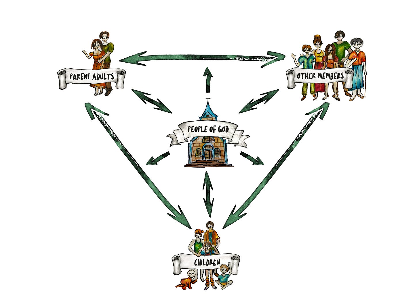 Here’s how I diagram the relationship between all three*. Each arrow represents the theological necessity of intentional engagement between the church (because of who and what it is), children (because of who and whose they are), and the relational connections that can be fostered by the church.